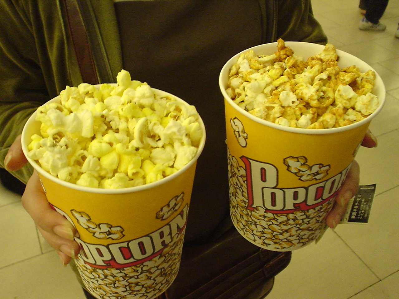 Yukoのポップコーンは左の塩味で、Nのは右のキャラメル味。